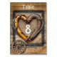 Rustic country wedding barnwood table card with heart shape, wood twig frame for your table number cards and wagon wheel with silver horse shoe.