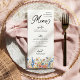Country wildflower wedding menu with headings in elegant calligraphy and a border of wild flowers in shades of pink, yellow, blue and white. Rustic flowers, elegant styling and a multi-season color palette combine, exuding effortless charm. The tapestry of colors in this pretty floral design will complement wedding settings from country estates through to informal bohemian gardens. For co-ordinating invitations, stationery, games and day-of-event decor, please browse my Country Wildflower Wedding Collection or message me to add any additional items you need.