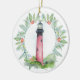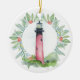 A perfect gift for newlyweds or anniversary weddings, this elegant acrylic Christmas ornament features your names and wedding date on the back with a replica of my original Jupiter Lighthouse art encircled by a holly and red berries. Your last name set in a fun hand lettered typography over a solid red background. Customize this round ornament with your names to create a unique keepsake for a Christmas wedding gift. To see more Florida Christmas designs by Victoria Grigaliunas visit www.zazzle.com/dotellabelle
