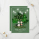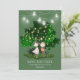 An adorable illustration of a boy standing with his hands behind his back clutching a bouquet of flowers and a girl wearing a pink dress standing with her head coyly tilted to one side. They are in love and are standing in a garden framed by a beautiful large green tree filled with faux glowing lights and mason jar string lights. The forest green background makes the lighting appear to sparkle and the white templates at the bottom may be personalized to suit your requirements. Additional information may be added to the back of the card.