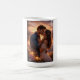 A romantic couple shares an intimate kiss beside a tranquil lake at golden hour, surrounded by soft lantern light and blooming flowers. The warm sunset reflects across the water, casting a dreamy glow over the scene as mountains fade gently into the background. The woman, dressed in an elegant lace dress adorned with delicate floral accents in her hair, is embraced tenderly by her partner, creating a moment that feels timeless and deeply emotional. The overall atmosphere evokes love, serenity, and cinematic romance, making this artwork ideal for romantic decor, wedding-themed products, and heartfelt gifts.