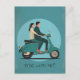 This green-based design has an illustration of a young couple on a retro Italian motorcycle. There is a default romantic message "Ride with me" which you can customize.