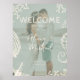 Seaside on the beach sage green and tan ocean destination wedding custom photo welcome sign printable poster featuring hand drawn starfish and ocean corals, and a chic whimsical retro style handwritten calligraphy script. +++++++ All colors are editable. Digital download available, +++++++++ Suitable for casual trendy beach coastal summer weddings.