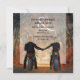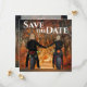 This unique Save the Date invitation features beautiful autumn forest road scenery with a boy and girl couple on motorcycles holding hands. The couple has blond hair. Other hair color combinations are available upon request! Perfect for a biker couple! Easily customize this Save the Date with all of the details for your wedding.