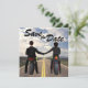 This unique Save the Date invitation features beautiful road and fields scenery with a boy and girl couple on motorcycles holding hands. The couple has brown hair. Other hair color options are available upon request! Perfect for a biker couple! Easily customize this Save the Date with all of the details for your wedding.