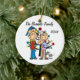 A pretty round ceramic keepsake Christmas holiday ornament features a stick figure family including a dad, mom, boy, baby boy, and family cat in front of a decorated Christmas tree with areas you can customize with your family name and the current year! This cute holiday keepsake ornament makes a great gift for the young family to commemorate a special year!