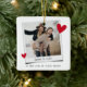 Funny cute personalized gift for a couple who met through online dating! Design features a photograph of the lovebirds with the text 'It was love at first swipe!', their names and a couple of red hearts. Design is repeated on both sides of the christmas ornament.
