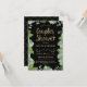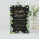 This customizable 3.5" x 5" (small) couples shower invitation features an illustrated border of green, gray and blue flowers with a black color background (that can be changed to your liking). The text "Couples Shower" is in a gold, modern script font. The bride-to-be and groom-to-be's names and event details can be customized for your special event. The back side is a matching black color (also changeable) with an overlaying gold quatrefoil pattern.