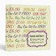 A handy coupon organizer binder featuring a beige background with entire surface covered in popular phrases found on coupons in green, yellow, red, orange, and yellow jewel tone text colors. Personalize with your name in gray at front bottom right. Personalize with your information on back bottom left.