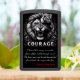 This high-contrast black and white image showcases the triumph over fear. A fierce lion roars, its teeth bared in a display of power, while a small tiger cub playfully climbs on its back. The dark background emphasizes the subjects. A stylized text box with "Courage" in bold, elegant red font is placed below. Nelson Mandela's quote adds meaning: "I learned that courage was not the absence of fear, but the triumph over it. The brave man is not he who does not feel afraid, but he who conquers that fear."