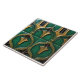 Four square tiles are arranged in a 2x2 grid, each featuring a distinct Art Deco-style design. The tiles are predominantly green with gold and black accents. The top two tiles display a stylized floral motif with a central vertical element flanked by curved shapes, all in gold and black, set against the green background. The bottom two tiles showcase a different design, with a gold circle of small dots surrounding a black and gold stylized flower shape.