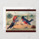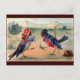 Vintage illustration of two cute blue and rose colored birds. She has a pretty flowered hat on and he has a hat, tie and collar. He's handing her a bunch of pink flowers.A mountain and pine trees are seen in the background.