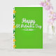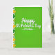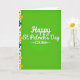 This card features a rich green background that shifts from a lighter green at the top to a deeper green near the bottom, setting a festive St. Patrick’s Day scene. Centered in the middle, “Happy St. Patrick’s Day” appears in flowing white lettering, with gentle shading that makes it stand out. Just beneath, the word “COUSIN” sits in white and is framed by two small arrows pointing inward, giving it a close, affectionate focus like a friendly nudge across the room 💚. Along the left edge, a slim white vertical stripe acts as a border, decorated with shamrocks in emerald tones and touches of goldenrod. Tiny white starburst shapes are scattered among the shamrocks, adding a light sparkle without crowding the layout ☘️. The open green space on the right balances the busier border, keeping the design easy to take in at a glance. Soft shadows under the text and around parts of the border create a subtle layered look, while the shamrocks and starbursts line the left side in a neat vertical run.