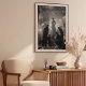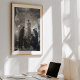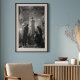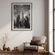 This stunning black and white photograph captures the dramatic intensity and quiet reverence of a haute couture fitting. A model, elevated on a pedestal like a living sculpture, is bathed in a celestial glow, her elegant gown a beacon of light against the shadows. Around her, a team of dedicated designers works with focused precision, their silhouettes a testament to the collaborative art of creation. The opulent salon, with its magnificent crystal chandeliers and grand mirrors, provides a breathtaking backdrop. The masterful use of high-contrast lighting creates a powerful, cinematic quality, turning a behind-the-scenes moment into a work of timeless art. Perfect for connoisseurs of classic photography, fashion history, and dramatic, narrative-driven imagery.