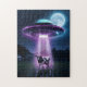 Mysterious scene of a UFO lifting a cow in a beam of light against the backdrop of a night sky with a full moon. Perfect illustration for fans of science fiction, and fantastic stories about contact with extraterrestrial civilizations.