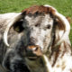 A photographic design of an English Longhorn cow a brown and white breed of beef cattle.
