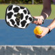 Black and white cow print with gold monogram, pickleball paddle with same design on both sides. Black monogram oval and gold monogram that can be changed to a name or any text as preferred.