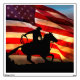 An award winning image by Stephanie Laird. A roping cowboy riding his horse with an American Flag in the background. Depicts an American Cowboy.