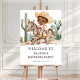 Create a custom cowboy-themed birthday party welcome sign with this delightful design. The sign showcases an intricately detailed illustration of a young cowboy confidently riding a majestic horse, set against a clean, white background. This charming image sets the perfect tone for a fun and festive birthday celebration.
