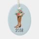 Keepsake ornament features a watercolor illustration of a cowboy boot with floral bouquet on light blue background. Customize with year or other special text
