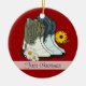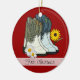 Country couple, first Christmas together ornament. Personalized this country western themed ornament on the back with any text using the template provided. Two pair of boots and little flowers on a red background is an original and unique design.