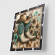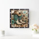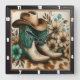 This stylish square wall clock features a pair of ornate cowboy boots, a classic cowboy hat, and a scattering of cream and teal wildflowers, all resting on a cowhide-patterned surface. The rustic yet elegant design brings a touch of Western charm and floral beauty to any space.