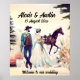 A cowboy and his bride are dressed in formal wear and are ready for their best day ever as they watch a saddled horse walk by.