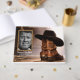 Cowboy funeral and memorial guest book with cowboy boots, cowboy hat and rope on a rustic wood background with rustic rope picture frame. This rustic cowboy western theme funeral guest book is easily customized by simply adding the photo and text of your choice.
