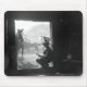 A silhouetted cowboy sitting in a doorway with horses and a corral in the background.