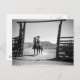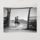 Cowboy on horseback riding through a gateway while roping on the Pitchfork Ranch near Meeteetse, Wyoming.