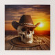 A striking artwork featuring a weathered cowboy skull adorned with a wide-brimmed hat, its hollow eyes staring into eternity. The lasso, coiled beneath the skull, symbolizing the rugged resilience of the cowboy spirit. A vivid sunset bathes the scene in warm hues of amber and crimson, casting dramatic shadows that enhance the hauntingly beautiful composition. The background hints at an endless desert landscape, evoking both solitude and adventure, making this piece a powerful homage to the untamed Wild West.