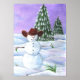 Rustic illustrated picture of a Cowboy Snowman in mounds of snow with snow covered pines, evergreens and purple sunset in the background.
