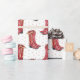 This christmas wrapping paper features a watercolor portrait of a pair of bright red cowgirl boots decorated with a gold ribbon bow.