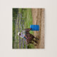 Cowgirl on horseback practicing barrel racing in jigsaw puzzle