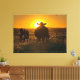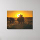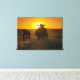 This brilliant art canvas shows a cow and calf standing behind a barbed wire fence on the Alberta prairies with the setting sun glowing behind the cow's silhouette.
