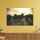 This sepia-toned wrapped canvas wall art has an image of black and white cows in a pasture with a bright sun behind them.