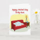 This card shows a cozy living-room scene that feels like a quiet moment shared with someone you care about ❤️. A deep red sofa sits across the lower part of the design, inviting and comfortable, with a loose pile of light blue and white fabric draped across the seat like laundry left behind after a caring visit. To the right of the sofa, a small dark wooden side table with two drawers adds a tidy counterpoint, as if someone thoughtfully set things in place for another person. On top, three slim blue books are stacked neatly, suggesting time spent together reading or chatting, with a tall lamp beside them topped by a warm amber shade. The wall behind is washed in pale yellow, while a muted sage-green floor area grounds the furniture in a calm, homey setting 🌼. Near the top, the message “Happy Mother’s Day To My Aunt” appears in flowing red lettering, centered above the room scene. The sofa’s rich red tone stands out against the soft yellow background, and the amber lamp shade glows gently above the blue book stack.