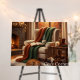 ultimate warm and inviting atmosphere with this beautifully detailed digital painting. Featuring a roaring fireplace, a soft armchair draped in chunky knit blankets ( (orange and green), an open book, and a sleeping tabby cat on a white shag rug. Perfect for adding a festive fall or winter touch to your living room, reading nook, or bedroom. Printed on durable Foam Core Board for a high-quality, lightweight display.