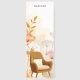 Create a warm, inviting reading nook with this cozy boho personalized bookmark, featuring a chic mid-century modern armchair. The armchair, with caramel brown upholstery and botanical patterns, is set against a lush background of soft watercolor washes and delicate dried floral elements. Stylized white baby's breath, burnt orange seed pods, and ochre foliage create a layered floral tapestry, with white speckles adding a playful, textured effect. The background transitions into creamy beige and fades into an airy white, adding depth and drawing the eye towards the comforting scene. Combining modern interior elements with natural motifs, this elegant accessory evokes a cozy boho aesthetic, perfect for adding a homey feel to your books.