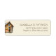 This return address label features a charming, hand-drawn illustration of a cozy wooden cabin with earthy tones of brown and gray, accented by warm yellow window panes. The design combines a whimsical, semi-realistic style with elegant serif typography for a clean and organized layout. Perfect for adding a touch of rustic charm to your mail, this label evokes a sense of tranquility and homeliness, making it ideal for those who appreciate quaint, inviting aesthetics.