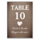 Cozy burlap theme wedding party Table Number cards. Vintage template with faded heart. Part of affordable collection with matching theme. Printed with names of bride and groom.