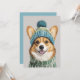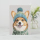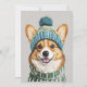 A heartwarming illustration of a cheerful corgi wearing a cozy knitted sweater and a matching blue and green beanie with a pom-pom. The pup’s bright eyes and joyful expression make this image perfect for winter vibes and pet lovers.