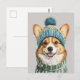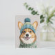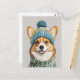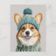 A heartwarming illustration of a cheerful corgi wearing a cozy knitted sweater and a matching blue and green beanie with a pom-pom. The pup’s bright eyes and joyful expression make this image perfect for winter vibes and pet lovers.