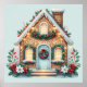 This charming holiday illustration features a cozy gingerbread house adorned with twinkling string lights, lush evergreen wreaths, and festive red berries. The soft snow-topped roof and warmly glowing windows create a welcoming wintertime scene, full of nostalgic cheer. Thoughtful details like candy-like shingles, a blue front door framed with a bright red bow, and whimsical floral accents bring a storybook quality to this seasonal design. Ideal for evoking the warmth and joy of traditional Christmas décor, this piece captures the spirit of home and holiday magic. Perfect for winter displays or festive projects that celebrate classic charm. AI generated artwork.