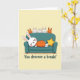 This card shows a plump white rabbit asleep on a cushy teal sofa, tucked under a speckled orange blanket that makes the scene feel like a quiet hug ❤️. Above the back of the sofa, five smaller rabbit figures peek over with closed eyes, as if they’ve all agreed to rest together like close friends. Two of the little ones are warm orange and three are white, each outlined in thin black lines that keep the shapes simple and clear. A golden star-shaped pillow sits near the main rabbit, adding a cozy accent like a small gift left by someone who cares 🌼. The background is a soft, even pale yellow with plenty of open space, giving the characters room to breathe and making the cuddle-like grouping stand out. Near the bottom, the message “You deserve a break!” is placed under the illustration in dark lettering that’s easy to read against the light backdrop. The teal sofa stretches horizontally across the center, with the orange blanket draped over the sleeping rabbit and the five tiny faces lined up along the top edge of the backrest.