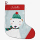 Cute holiday stocking featuring an illustration of a polar bear wearing a hat and a scarf.