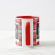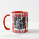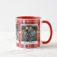 Red & white plaid fabric 3 photo family mug. The design features a faux red and white plaid flannel fabric texture design with hints of light pink. Personalize with three special photos, and customize with your name(s). Designed by Moodthology Papery