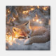 Experience the magic of winter with this serene image of a red fox peacefully sleeping in the snow, surrounded by glowing fairy lights and a rustic lantern under snow-dusted pine branches.