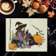A touch of cozy autumn magic. A serene brunette witch all in purple and orange sipping a warm drink beside her loyal black cat, surrounded by pumpkins, falling leaves, books, broom and a bubbling cauldron of wildflowers, mushrooms and small pumpkins. Capturing the whimsical charm of fall and Halloween. Witchy vibes, black cats, and the cozy season of pumpkins and falling leaves.