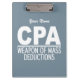 “Weapon of mass deductions”. Change the text field to what you want. You can also change the font and its size and color by using the "Customize it" function, as well as add more text fields if you wish. You can also change (edit) the background color of this item to any color of your choice. See my store for more items with this design.